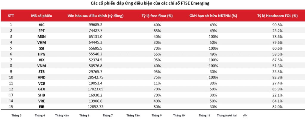 Bên cạnh đó, một nhóm cổ phiếu đặc biệt khác cần được theo dõi là những mã có khả năng lọt vào rổ chỉ số FTSE, nhóm sẽ được các ETF ưu tiên phân bổ vốn. Dựa trên giả định của ASEANSC, khoảng 15 mã cổ phiếu tiềm năng như VIC, FPT, MSN, VNM… sẽ có cơ hội lớn thu hút dòng vốn mạnh mẽ ngay khi quá trình nâng hạng chính thức bắt đầu.