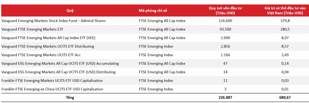 Với nhóm ETF, dòng tiền phân bổ có thể được ước tính khá rõ ràng. Theo tính toán của ASEANSC, ngay trong giai đoạn đầu tiên (dự kiến vào cuối năm 2026), các ETF mô phỏng theo chỉ số thị trường mới nổi (Emerging Markets) của FTSE có thể phân bổ hơn 680 triệu USD vào thị trường chứng khoán Việt Nam.